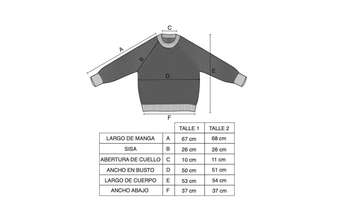 Compará tus medidas con las de la tabla. Todas tus medidas tienen que entrar en uno de los talles. Tené en cuenta que los tejidos de punto estiran y se acomodan al cuerpo.