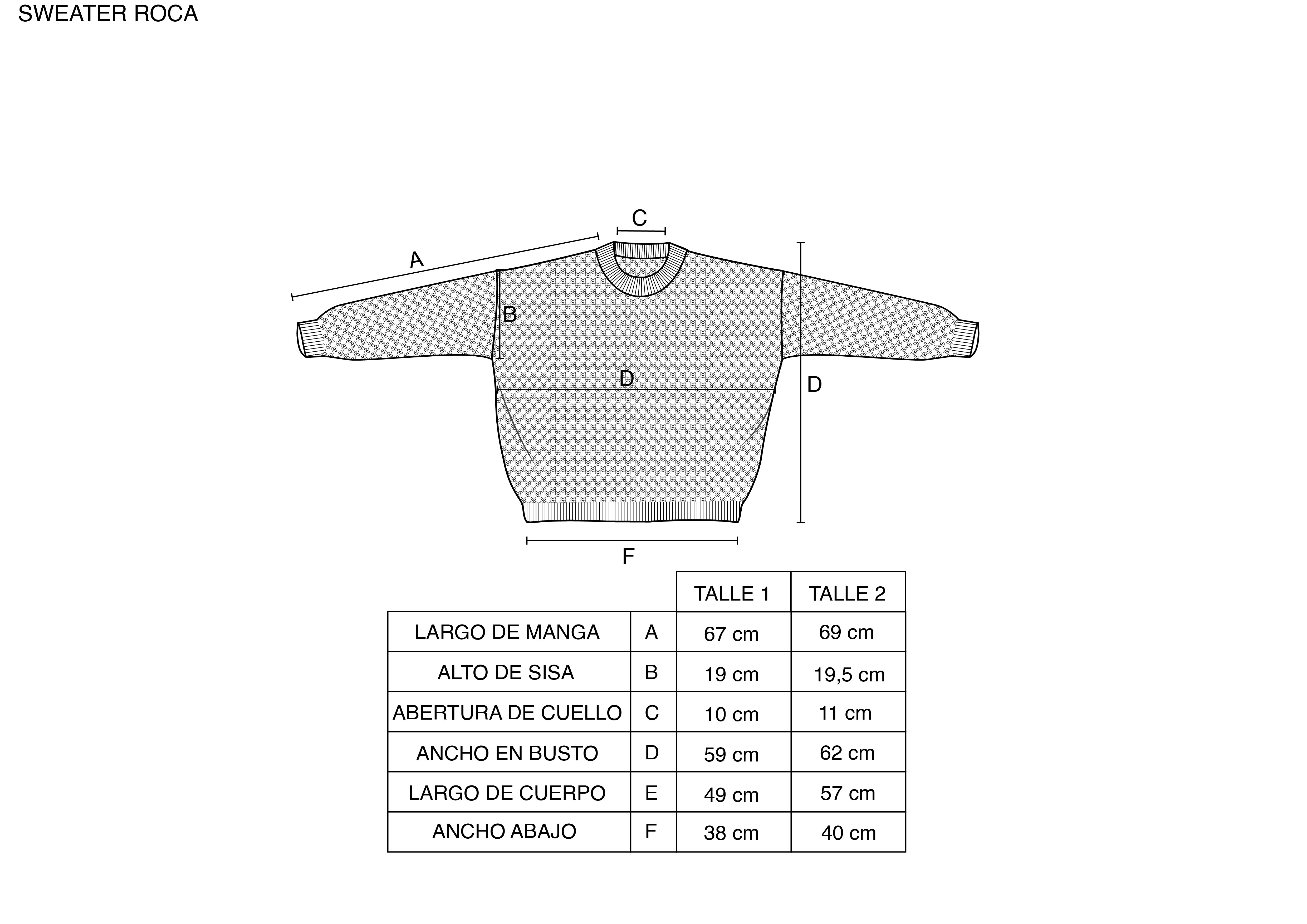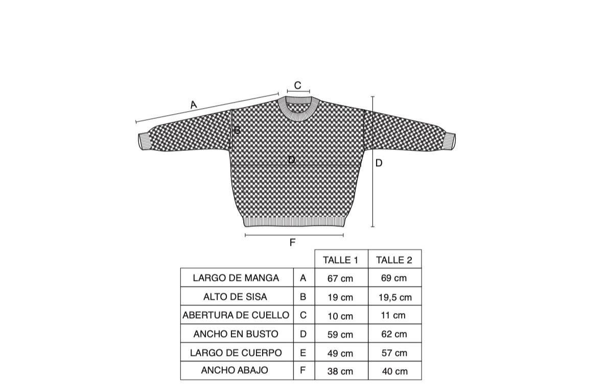 Las medidas están expresadas en centímetros y pueden variar por sus procesos artesanales.Sweater de 100% algodón tejido en punto arroz grueso. Es cuadrado amplio y flojo. Tiene puños en manga y cadera.